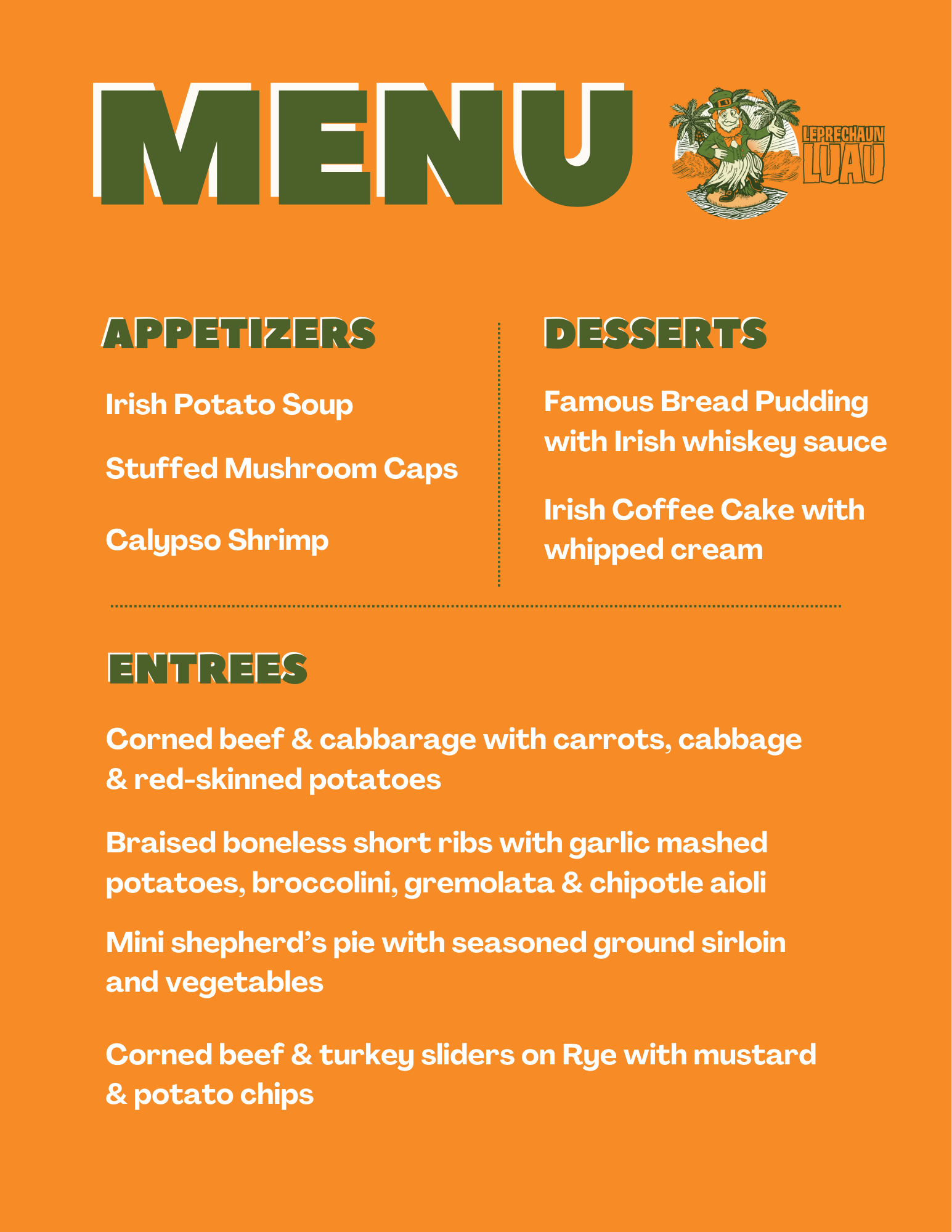 When the Emerald Isle meets the South Pacific, the flavors are unforgettable! Enjoy a festive catered menu featuring Irish-inspired favorites plus delicious desserts to top it all off.